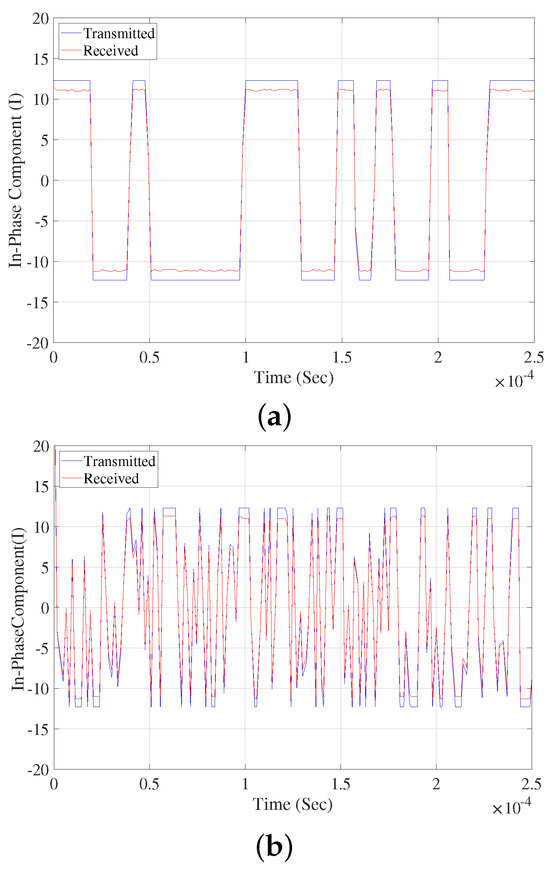 Transmitted and received in-phase (I) (a) and quadrature (Q) (b) signals of a GPS signal having 2 MHz bandwidth at 1575 MHz signal carrier frequency.