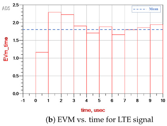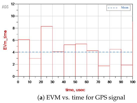EVM vs. time plots for (a) GPS signal and (b) LTE signal.