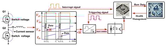 Figure 1 illustrates the signal acquisition approach for an SiC-based DAB converter. First, the switch’s on-state current and voltage are measured using sensors. Then, either the gate-source voltage (Vgs) or the drain–source voltage (Vds) triggers an interrupt in the MCU to generate a signal for data recording, as capturing all data within a single switching cycle is not feasible. Once recorded, the data is converted into a digital format. After passing through an isolation stage, the MCU receives the data via the SPI protocol. Finally, the processed data is sent to the cloud for further analysis.