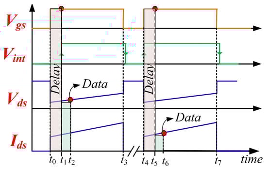 Triggering and delay approach for data collection and synchronization between on-state voltage and current sampling. From top to bottom: gate-source voltage (Vgs), interrupt signal (Vint), drain–source voltage (Vds), drain–source current (Ids).