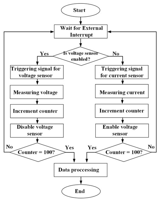 Figure 4 presents the flowchart of the data acquisition technique used to capture the on-state voltage and current of the SiC MOSFET in the DAB converter. The process begins with the MCU waiting for an interrupt signal. Based on whether the voltage sensor or the current sensor is activated, the corresponding next step is executed.