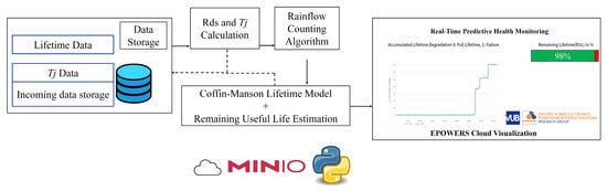 To develop the cloud system, a brand-independent and open-source Minio Cloud Object Storage platform is utilized. This cloud solution supports remote data storage and is compatible with the Amazon Simple Storage Service (Amazon S3) format. The local cloud system runs a Python-based application for RUL estimation, utilizing Pandas, NumPy, and SciPy modules for efficient mathematical calculations and data storage. The Python application runs the following computations and algorithms: Tj calculation, Rain flow cycle counting algorithm on a batch of Tj data, Coffin Manson lifetime model calculation, and RUL estimator. The edge device continuously transfers Vds,on and Ids,on data to the cloud, where it is stored as objects with timestamps. Additionally, the cloud tracks the number of received (Vds,on, Ids,on) data points.
