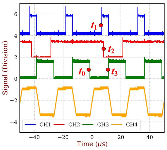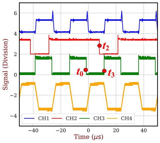 Figure 8 depicts the Vgs of the upper switch, Q11, which operates in a complementary manner to that of Q12. This is why the signal is labeled as NOT Vgs. As a result, the rising edge of Q12’s gate-source voltage corresponds to the falling edge of Q11. Moreover, the time points t0 to t3 are labeled based on the timing sequence shown in Figure 3, where t0 marks the moment the DUT is turned on, t1 represents the time when the interrupt signal ends to the MCU, t2 indicates the moment the MCU begins triggering the ADC, and finally, at t3, the DUT turns off.