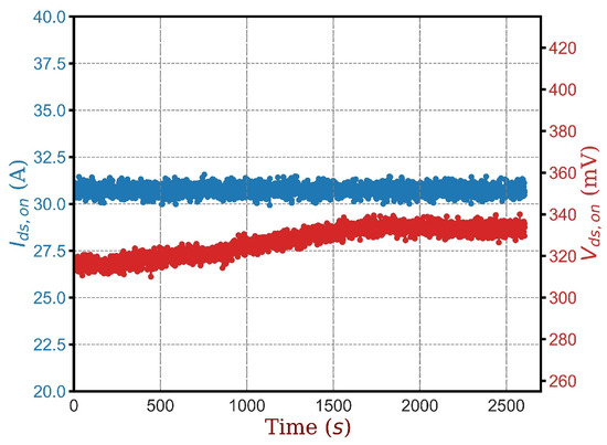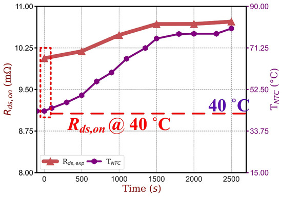 During the operation period, the NTC temperature is recorded, and Equation (3) is used to calculate the corresponding resistance value, referred to as Rds,chr. This computed value serves as the baseline for comparison with the experimentally measured resistance from the condition monitoring circuit, Rds,exp.