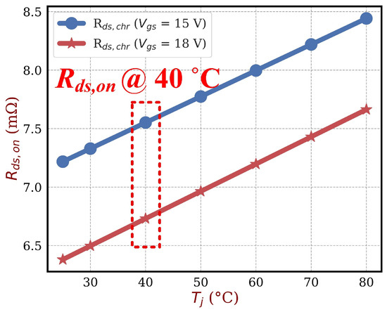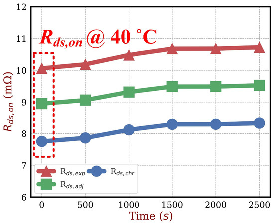 Using Equation (5) along with the measured characterization value at 40 °C (7.5 mΩ), we can conclude that the error from parasitic impedance is about 1.2 mΩ. Consequently, to account for this deviation, the characterized resistance value Rds,chr is adjusted by incorporating the parasitic elements’ impact. This adjusted resistance value is referred to as Rds,adj, and is presented in Figure 13. This correction guarantees that the resulting Rds,adj accurately represents the intrinsic channel resistance, free from switching-related artifacts.