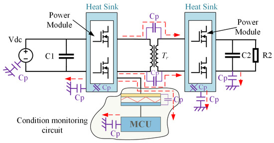 Depiction of common-mode noise in the DAB converter and the circuitry for condition monitoring.