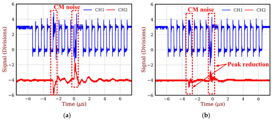 Experimental waveforms illustrating the influence of the common-mode choke on the common-mode current (ICM) of the DAB converter and the SPI clock signal. CH1–SPI clock signal (1 V/div), CH2–ICM (2.4 A/div). (a) Without common-mode chokes, (b) with common-mode chokes.