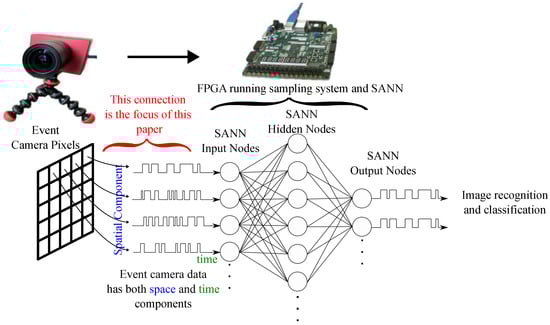 The neural network (NN) implemented on the FPGA is a stochastic artificial neural network (SANN) [,]. A SANN, of our design, has an input node for each pixel in the camera, Figure 1. An advantage of the sampling system described in this paper is that it is specifically designed to work with a SANN. This provides, in practice, a way to test stochastic computing processing of event camera data. This might result in stochastic computing advantages such as low-complexity computation circuits and error tolerance [].