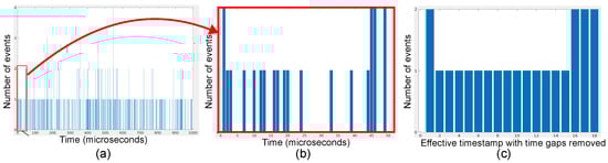 An additional effect of the nature of the sampling system being designed is that only timestamps at which events occur will factor into the stochastic values input to the SANN. If “gaps” occur between timestamps at which no events occur, these gaps will not factor into the stochastic values. This ensures that the stochastic values associated with the camera’s outputs will not be lessened by any gaps that occur with no events (which can lead to less accuracy in image recognition), and only information associated with actual movement in the camera’s view will be considered. A diagram illustrating the concept is shown in Figure 3. This figure shows how ignoring the time gaps leads to concentration/compression of the event camera data.