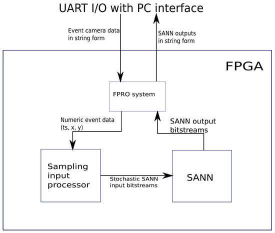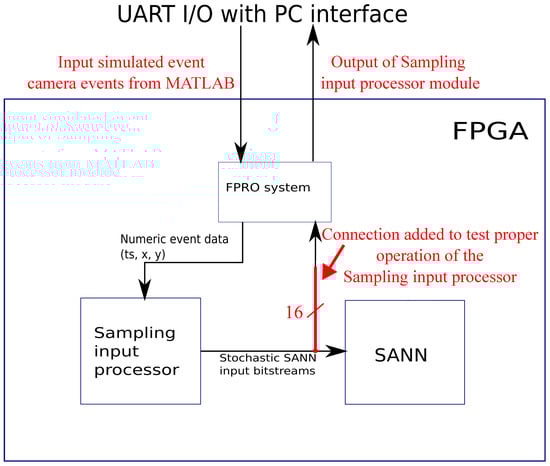 Figure 4 illustrates the full system used for this design. It consists of three major subsystems: (1) a subsystem to implement Universal Asynchronous Receiver/Transmitter (UART) Input/Output (I/O) interface with the FPGA, (2) a SANN to perform the image recognition, and (3) the sampling input processor, which is the main focus of this paper. The UART interface was implemented using Xilinx’s MicroBlaze microprocessor [] and Pong P. Chu’s FPGA Prototyping (FPro) system, a system-on-chip design allowing communication between the MicroBlaze software (version 2022.2) and the FPGA hardware []. The FPGA board used in this project was the Digilent Nexys4 DDR prototyping board, which makes use of a Xilinx Artix-7 FPGA []. This board was selected because of the board’s availability and the author’s pre-existing experience with the hardware and software. The SANN design used for this project is a sequential, fully-connected neural network that has 256 inputs which represent a 16 × 16 grid of pixels. The SANN had 32 hidden nodes and 10 outputs, one representing each digit in the MNIST dataset (0 through 9) on which the system was trained and tested. The SANN itself and the FPro system will not be discussed in detail, as they are not the primary focus of this paper, however, Figure 4 shows how the three major subsystems interact with each other. The remainder of Section 3 focuses primarily on the event data processor subsystem, i.e., the “Sampling Input Processor” system.