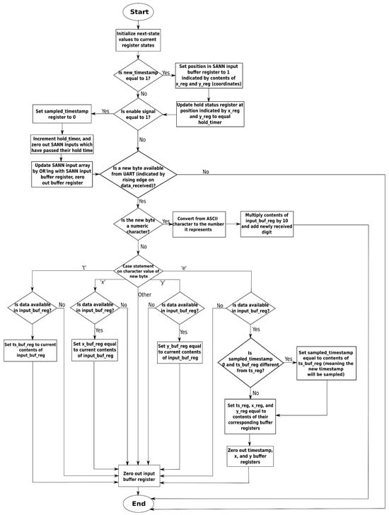 Once the three pieces of event data (timestamp, x-coordinate, y-coordinate) have been written to their respective final registers (ts_reg, x_reg, and y_reg), they still need to be translated into SANN inputs. Due to the sampling nature of the system, however, only the events that occur at the timestamp contained in the register sampled_timestamp will be translated. As mentioned earlier, the signal new_timestamp marks when this condition is true. When new_timestamp is equal to 1, another buffer register, equal in size to the SANN input register (256 bits in this case), is used to store the SANN input locations which are to be set to 1. This register is called sann_inputs_buf_reg. While new_timestamp is 1, the contents of the x- and y-coordinate registers (x_reg and y_reg) are used to determine which locations in this array should be set to 1. The SANN input array represents a linearized version of a square array of event camera pixels. For a  array of pixels, the SANN input array would be  bits long (which is why this system, which is based on a 16 × 16 input array, has a 256-bit input array). The position in this linearized pixel array corresponding to an event received at position (x,y) would be at position × (assuming that the received coordinates index from 1 and Verilog’s arrays index from 0, as is the case in this design). This position of sann_inputs_buf_reg to be set to 1 is determined by substituting the contents of x_reg and y_reg into this formula, and is stored as a 10-bit value called input_ndx. This will occur for every event received with the timestamp to be sampled.