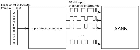 The first task performed by the input_processor module in Figure 4 is to convert the ASCII character strings received from the UART port into numeric event data. Figure 6 shows a simple representation of how the character data is translated into stochastic SANN inputs by the input processor module. Chu’s UART module [] was modified to output both the last byte received (called “last_byte_received”) and a signal to alert the main system that new data is available (called “data_received”). Both of these signals are sent as inputs to the input_processor module. When a rising edge is detected on data_received (indicating there is new data which has not been processed yet), the system begins processing the data in last_byte_received. First, it is determined whether or not this byte is a numeric character (0 through 9). If it is, the value is converted from character to unsigned integer form (equal to the numeral represented by the character) and stored to a register called “input_buf_reg.” This register is used as an input buffer to properly assemble data from the individual bytes from UART. As numbers are sent into the system in character form, digit by digit, the next-state value for input_buf_reg is multiplied by 10 and added to the newly received digit (after converting from character to integer) and re-written to input_buf_reg. This serves to shift the existing decimal digits left by one, and add the new digit as a least significant value (ones place). This process continues until a non-numeric character is received. To accommodate the extremely large timestamp values sometimes produced by a real event camera, 64 bits were used for input_buf_reg.