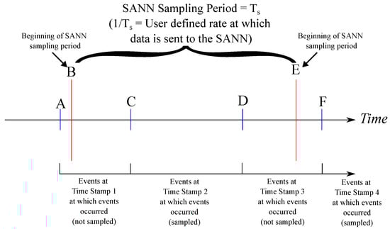 The second task performed by the input_processor module was to select a timestamp to sample during each sampling period (time interval of ), and collect the events which occur at that timestamp. All events at one timestamp per sampling period are selected to be translated into SANN inputs during this task. As event strings are sent continually to the system and  is set by the user such that it is guaranteed to be possible to receive all events at the sampled timestamp, there will always be sampled event data to translate to SANN inputs at the end of each sampling period.
