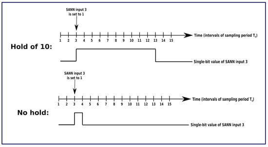 Illustration of the input processor module’s hold functionality for non-sparse data. For the purpose of this diagram, it is assumed that the only time the input processor output corresponding to SANN input 3 is actively set to 1 during the timeline shown is at sampling period 3. It can be seen that with a hold value of 10, input 3 of the SANN (corresponding to output 3 of the input processor) is “held” at 1 for ten sampling periods, whereas with no hold it is set back to 0 after one period.