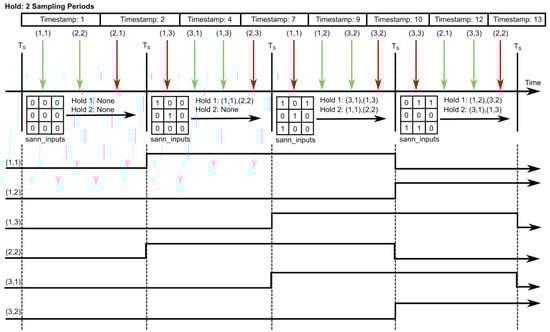 Illustration of the input processor module’s hold functionality for sparse data. This figure shows the events occurring at a timestamp that falls entirely within one of the sampling periods (green) being set and held in the sann_inputs register for 2 sampling periods after the event occurred. It also shows the events occurring at a timestamp that does not fall entirely within one sampling period being ignored (red).