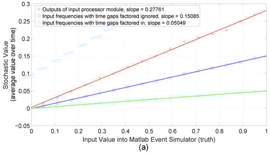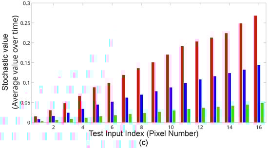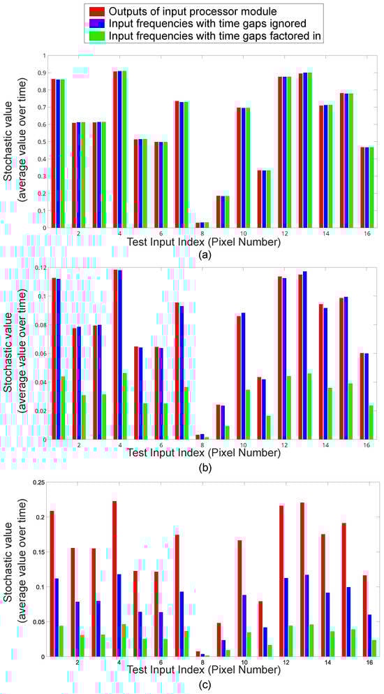 Over time, the value of the FPGA’s outputs (corresponding to the input_processor_test module’s outputs) were accumulated and interpreted as stochastic numbers []. Each of the 16 outputs was calculated according to (1).