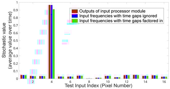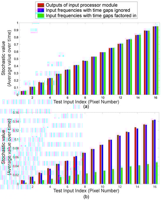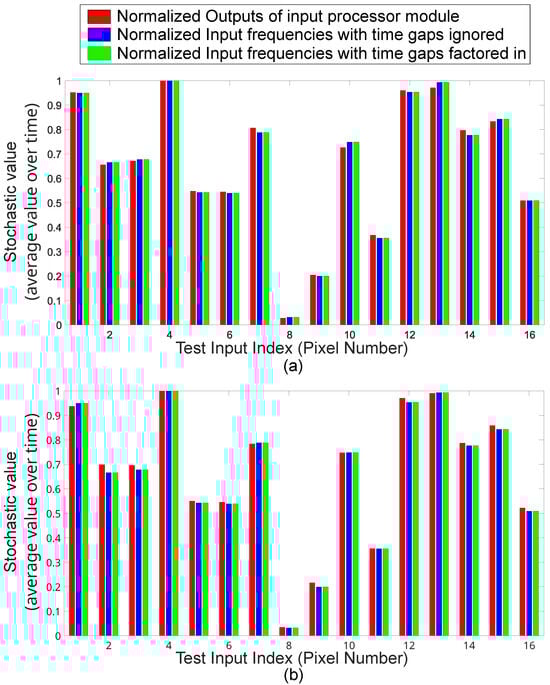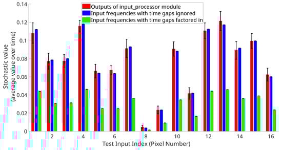 For the first test, the input processor was instantiated with no hold (accomplished by setting its hold parameter to 1). A set of input data was created by generating 16 values between 0 and 1 and converting these values to a series of simulated camera events, using MATLAB, with the frequency of events at each of the simulated 16 pixels being equal to its corresponding random value between 0 and 1. These simulated events were sent to the input processor module through the UART port, and the module’s outputs were sent directly through the UART port to be read in MATLAB. The results of this test are shown in Figure 11a. It can be seen that the input processor module’s stochastic outputs from the FPGA closely match the actual event frequencies being sent to the FPGA. This is shown by the red and green bars being approximately the same.