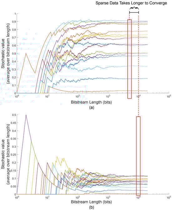 FPGA hardware output data analysis of convergence times for the sampling input processor data. This time-series data corresponds to the data in Figure 11. The Figure 11 data was sampled at bit stream length 20,000 which is when all data has had a chance to converge to steady-state values. As expected with stochastic systems, sparse data takes longer to converge. (a) Convergence times for the data in Figure 11a, (b) Convergence times for the data in Figure 11b.