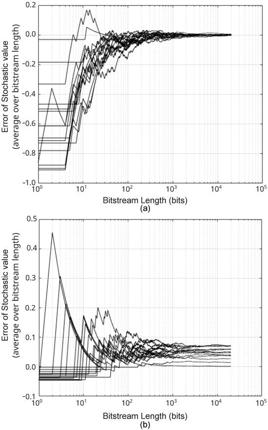 FPGA hardware output data analysis of how the output accuracy/error for the sampling input processor data changes with increasing bitstream length. This time-series data corresponds to the error in the data in Figure 13. (a) Convergence error for the data in Figure 13a, (b) Convergence error for the data in Figure 13b.