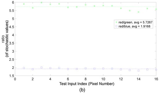 Figure 11b,c show that the absolute values of the input numbers are not maintained by the input processor when all inputs are sparse and when using a hold, however, the relative differences between each color bar’s values are maintained. Figure 15 shows an example of plotting normalized Figure 11b,c data where all red bar data are divided by the max red bar value and plotted, all green bar data are divided by the max green bar value and plotted, and all blue bar data are divided by the max blue bar value and plotted.