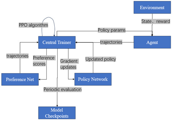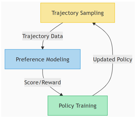 - Training Efficiency: Support parallel trajectory sampling and periodic policy updates to reduce training time. Based on these objectives, the system is divided into three functional modules: Trajectory Sampling Module Preference, Modeling Module, and Policy Training Module. These modules work together to form a closed-loop policy optimization process.
