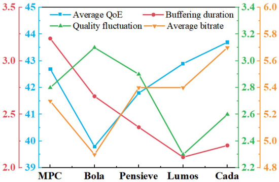 The comparative QoE performance of MPC, BOLA, Pensieve, Lumos, and our proposed CADA method is illustrated in Figure 4. CADA achieves an average QoE score of 43.7, surpassing the four benchmark algorithms by margins of 2, 9, 4, and 4 percentage points, respectively, as quantified in Table 2. Regarding rebuffering duration, CADA maintains 2.21 s, representing significant reductions of 31.15% compared to MPC, 17.23% against BOLA, and 7.14% relative to Pensieve, though marginally higher (5.24%) than Lumos. Furthermore, CADA demonstrates substantial improvements in average bitrate: 7.55% higher than MPC, 16.33% over BOLA, and identical 5.56% gains versus both Pensieve and Lumos.