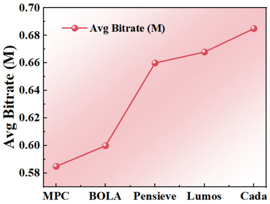 To further validate the generalization capability and practical applicability of the proposed preference-driven adaptive bitrate strategy (Cada-PPO), we conducted supplementary experiments on the publicly available LIVE-NFLX benchmark dataset. This dataset, jointly released by Netflix and the University of Texas at Austin, comprises diverse real-world video content paired with corresponding subjective user ratings, covering various scenarios such as high-motion and low-motion sequences. It provides comprehensive QoE annotation data and has been widely adopted for video quality assessment studies. Figure 5 shows the average bitrate results, while Figure 6 presents the rebuffering time comparison.