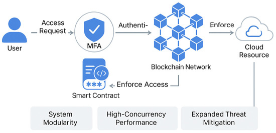 Despite these advancements, gaps remain in integrating blockchain and smart contracts into cloud environments effectively. Previous works often fall short in addressing the specific challenges encountered in real-world cloud environments, such as high latency in real-time access permission updates; lack of federated identity synchronization across heterogeneous cloud platforms; and the absence of reliable, auditable logs for policy enforcement and violations [4,5]. These shortcomings become critical in multi-tenant or hybrid cloud deployments, where centralized access control systems cannot guarantee consistent policy enforcement or real-time revocation across globally distributed regions. To overcome these limitations, this study introduces an innovative framework that leverages blockchain-based smart contracts combined with multi-factor authentication (MFA). Unlike prior works, this system not only mitigates threats like unauthorized access and data breaches but also enhances scalability, traceability, and usability through decentralized and tamper-proof operations [6].