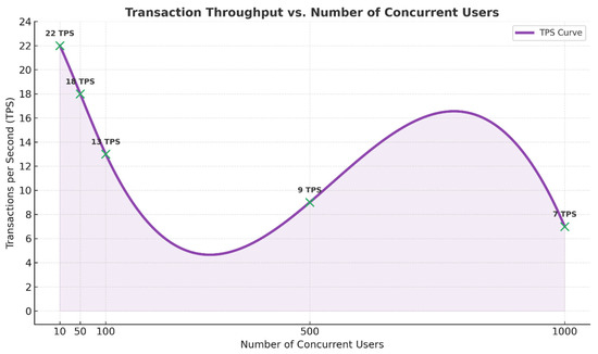 Throughput declines as the user load increases. The system achieves 22 TPS at 10 users but drops to 7 TPS at 1000 users (Figure 15). This trend highlights the scalability limitations under high concurrency and suggests the need for optimization.