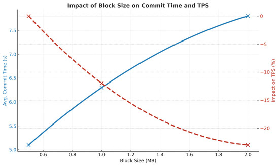This dual-axis graph (Figure 16) shows that larger block sizes (up to 2 MB) increase the average commit time from 5.1 s to 7.8 s while reducing TPS performance by up to 23%. Optimal block sizing is necessary to balance performance and efficiency.