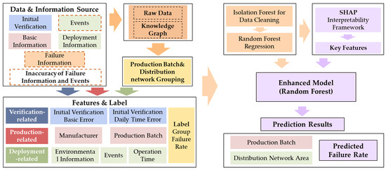 This paper integrates expert knowledge with knowledge mapping to analyze the significance of raw data. It proposes a grouping assessment method that combines production batch and distribution network information, and categorizes the data into three types: verification-related, production-related, and deployment-related. Targeted processing is then applied to each category, transforming various types of raw data into a unified set of failure-related features. For the multimodal failure features, data anomalies are addressed using Isolation Forests. Subsequently, a decision tree ensemble learning model, specifically the random forest, is employed to conduct research on data-driven failure rate modeling for smart energy meters. The specific process is illustrated in Figure 1.