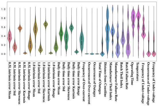 Features including “the kurtosis of the intrinsic error at a 0.5 L power factor,” “the kurtosis of the intrinsic error at a 1.0 power factor,” “the kurtosis of daily timing error,” “the labeling of the failure rate,” and “the frequency of under-voltage” show violin shapes that are narrow near zero but extend into long tails. This indicates most groups have values close to the mean, but a small number of outliers drive extreme deviations. For instance, the long tail in “the labeling of the failure rate” aligns with real-world scenarios where most meter groups have low failure rates, while a few high-risk groups skew the distribution. These outliers require careful handling during modeling to avoid overfitting.