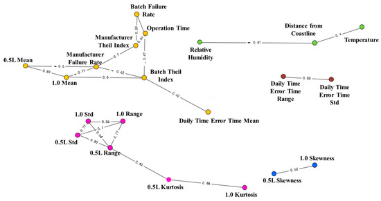 The direct and indirect associations among various related state features are illustrated in Figure 3. Certain state features that form clusters, such as the 1.0 intrinsic error standard deviation, 0.5 L intrinsic error standard deviation, 1.0 intrinsic error range, and 0.5 L intrinsic error range, suggest that these features may play similar roles in the data or be influenced by comparable factors. The features corresponding to the nodes within the same cluster that exhibit the most connections with other nodes can be considered key features. Examples include distance from coastline, 0.5 L intrinsic error range, manufacturer’s failure rate, and batch Theil index, as depicted in the figure. These key features may have the capacity to represent those at other nodes while retaining the most information and simplifying the set of state features as much as possible.