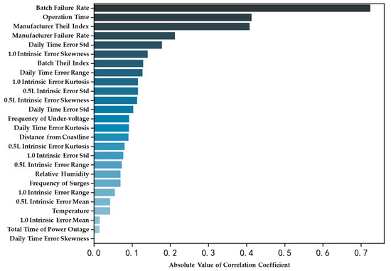 In order to comprehend the extent of the correlation between various state features and failure rate labels, horizontal bar charts illustrating the absolute values of the correlation coefficients for each state feature and the corresponding failure rate labels are presented, as shown in Figure 4.