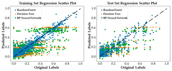 A comparison of the random forest model utilized in this paper with other models on the test set is presented in Table 2. Additionally, a scatter plot illustrating the regression of the labels for both the training and test sets is displayed in Figure 5. The dashed line represents the ideal distribution, indicating perfectly accurate regression.