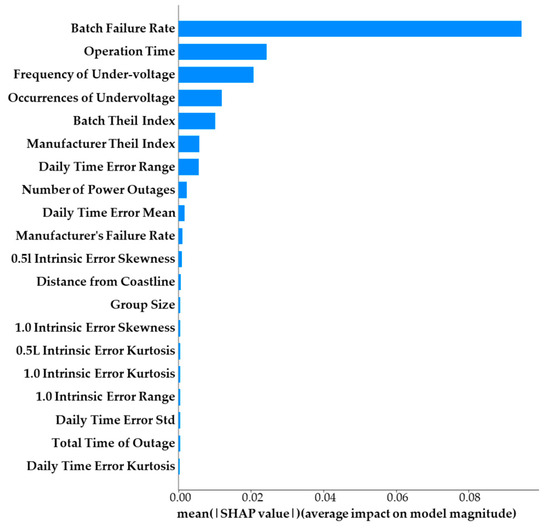 As illustrated in Figure 6, the running time, manufacturer and batch failure rate, Theil index, and frequency and occurrences of undervoltage are the most significant features. These findings align with the results produced by the model. The model’s accuracy is significantly compromised when these features are absent, indicating that they contribute the most to the model’s performance. Notably, with a relatively low correlation coefficient, frequency and occurrences of undervoltage are considered important, validating experts’ consultation mentioned in Section 5.3.