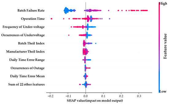 As illustrated in Figure 7, the feature swarm diagram reveals that the features of batch failure rate, undervoltage frequency, kurtosis of the 1.0 power factor measurement error, and the number of outages exhibit a clear distinction in their influence on the grouping failure rate. For instance, lower kurtosis values affect model outputs positively. This effect increases the predicted group failure rate. Conversely, when the number of outages is low, it has a minimal effect on the model output, indicating that a lower number of outages does not contribute to the grouping failure rate. However, as the number of outages increases, the grouping failure rate also rises.