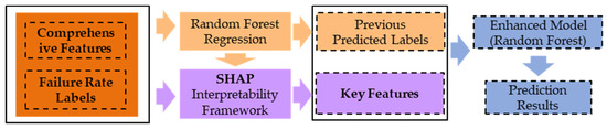 To verify the effectiveness of SHAP in extracting feature importance and to demonstrate its impact on prediction accuracy, the previously mentioned random forest model is utilized. Additionally, a second random forest model is integrated in the background to create an augmented model. This augmented model utilizes the high-importance features identified by SHAP, along with the output of the original model, as inputs. The process is illustrated in Figure 8.