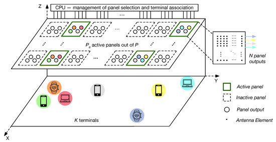 - is a binary vector, where indicates whether the kth terminal is served by the pth panel, and , meaning that only N terminals can be served if the pth panel is activated.