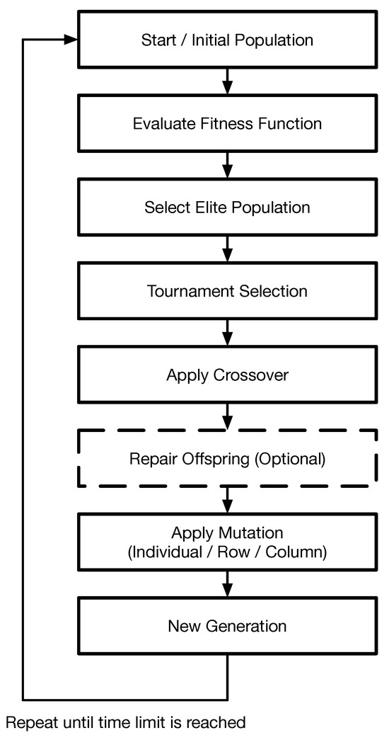 Our investigation was conducted with population size and TL was set to s. In all simulations, tournament selection is considered, in which the number of individuals to be picked randomly, R, is of population size POP, which is 4. The R-way tournament selection procedure is repeated , meaning that only half of the initial population is selected for crossover and mutation, with . Regarding the crossover operator, swapping factor is set to , with the number of columns to swap between parents being given by . Two different mutation operators are taken into consideration, mutation per individual and mutation per row/column, with mutation rate . In case mutation per individual is applied, constraint only decides which individuals will be mutated. Similarly to the crossover operator, swapping factor is set to , with the number of rows or columns to swap within an individual being given by or , respectively. If mutation per row/column is considered, the number of rows/columns is entirely decided by the constraint , which is not set manually. Finally, elitism is used in some simulations aiming at preventing the random destruction caused by crossover or mutation operators of some important individuals. In our case, only the of the best individuals are selected to pass directly to the next generation, thus having individuals in this condition. Even though they pass directly to the next generation, they are still used for crossover and mutation purposes, having an important role in the convergence of the algorithm. The GA ran ten times for each case and exactly followed the structure of Algorithm 1. The stopping criterion for the GA was a fixed time limit, corresponding to a maximum number of generations within that time, as our objective was to assess its performance against the CPLEX solver to evaluate the trade-offs in solution quality and time computational efficiency. The GA and the CPLEX solver were executed on the same system under identical conditions. The experiments were conducted on a machine equipped with Intel(R) Xeon(R) Silver 4110 CPU @ 2.10GHz (Intel Corporation, Santa Clara, CA, USA), with eight cores, 16 threads and 64 GB RAM, running Ubuntu 18.04.6 LTS.