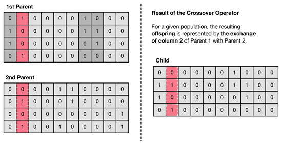 In GAs and evolutionary computation, crossover, also called recombination, is a genetic operator that exchanges genetic information of two parents to generate new offspring. It is one way to stochastically generate new solutions from an existing population. Multiple-point crossover, uniform crossover, one-point crossover and substring crossover constitute common crossover operators. Since we are working with matrices, a column-swapping crossover operator is considered. This method changes arbitrary columns between two parents (known as individuals) to generate POP children (new individuals). The number of such columns is given by , where represents the swapping factor and P denotes the number of panels in total. Their position is chosen at random and is the same for both parents. It is important to mention that this method can easily be modified to row swapping; however, in this work, we only consider column swapping.