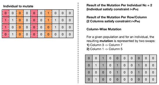 - Step 5 (column-wise mutation): Assume there are columns to exchange within a given individual, with also being given by the same number for all individuals to be mutated. For each column, perform the next steps. Generate two random integers , with . Columns and are exchanged in matrix .
