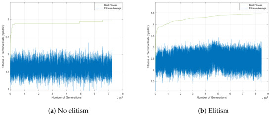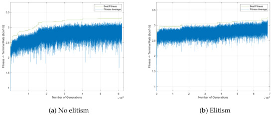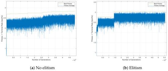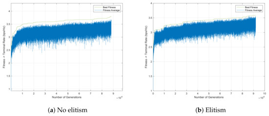 Figure 7, Figure 8 and Figure 9 represent the GA evolution along 600 s (10 min), employing mutation per individual and a crossover operator both with , respectively, considering the mutation rate . The main difference between Figure 7, Figure 8 and Figure 9 lies in the swapping factor, , used during the crossover operation. Each figure presents results for both elitist and non-elitist populations. A quantitative analysis of these results is provided in Table 2.