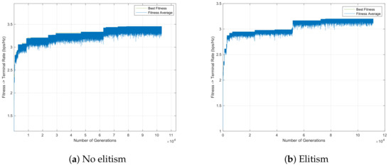 In all cases, the use of elitism does not represent a decisive factor for achieving a better solution, which in our case is the minimum SINR. So in some cases, having elitism does not mean achieving a better solution along the algorithm running time, as shown also in Table 2 for 10 runs. Furthermore, the performance results employing elitism and not employing it are similar, including in the low diversity created by crossover and mutation operators. Regarding the parameter, considering higher values, meaning more changes during crossover and mutation, leads to the random destruction of solutions, proven in Table 2, showing no improvement in the best solution as increases.