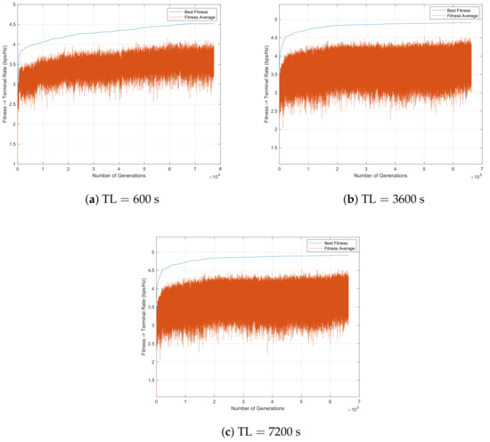 It is observed that the CPLEX solver is able to provide a feasible integer solution within of the optimal, which is extremely close to the optimum value (the default gap is in CPLEX). This feasible integer solution is used for comparison. The GA algorithm runs for s, achieving a solution % lower than the one achieved in the CPLEX solver, respectively. Although mutation per column/row is able to provide higher diversity (enabling the GA algorithm to evolve successfully), the CPLEX solver continues to deliver better solutions (i.e., higher max–min terminal rates) in comparison with the proposed GA algorithm. However, Table 6 shows that, while the CPLEX solver converges to a feasible solution after 240 s (with an optimality gap of ), the proposed GA algorithm is still capable of providing acceptable solutions in less running time (i.e., 60 to 120 s). In fact, the solutions provided by the proposed GA algorithm yields performance losses ranging from 18.85 to 12.30% (in comparison with the feasible integer solution provided by the CPLEX solver), making the proposed GA algorithm particularly attractive for scenarios where faster approximations are preferred over exact solutions. Therefore, the proposed GA is capable of delivering satisfactory solutions in a faster manner without the need for extensive computational resources. Based on a linear interpolation of the results, the number of generations required to reach 95% of the optimal fitness (i.e., ) is approximately 59,268 generations. Furthermore, the convergence can be empirically verified in Table 6 as the number of generations increases because when the stopping condition (i.e., the time limit or maximum number of generations) is increased, the SINR solution obtained by the GA also improves progressively. This indicates that the GA continues to refine the solution and move closer to the optimum as more generations are allowed.