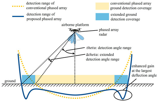 Phased array radars on airborne platforms are widely used for ground target detection. To broaden the detection coverage, enhancing the scanning gain at larger deflection angles is crucial in compensating for the gain loss due to increased distance. However, conventional phased arrays typically experience gain degradation at large deflection angles [1,2]. This leads to an imbalance: the array exhibits an excessive gain in the vertical direction, while gain attenuation at larger deflection angles limits the overall angular coverage of the detection system. This limits the radar’s ability to maintain uniform detection performance across its scanning range. As illustrated in Figure 1, if a phased array radar can be designed to reduce the gain in the vertical direction, avoiding significant gain overflow and simultaneously enhancing the gain at the largest deflection angle (i.e., the deflection angle corresponding to the largest detection distance) to compensate for the increased detection range, it would achieve broader detection coverage compared to conventional phased array radars. In the figure, the extended detection range is manifested as extended ground detection coverage, indicated by the blue ground region, and an extended detection angle range, denoted by .