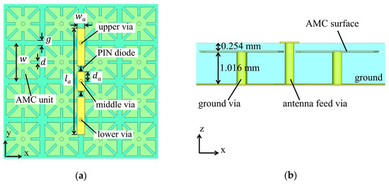 The proposed antenna operates at 17 GHz and employs the Rogers RT/Duroid 5880LZ substrate (εr = 2.0, tanδ = 0.0027). The model of the RPRDA is illustrated in Figure 2. The top layer comprises dipole patches, where two PIN diodes aligned in the same direction connect the three segmented patch sections. The PIN diodes are the commercially available MADP-000907-14020. Each section includes metallic vias for signal feeding: the upper and lower vias are used for DC bias injection, while the central via is used for radio-frequency (RF) signal input. The middle layer of the antenna structure comprises an AMC surface composed of periodic square units, with each AMC unit connected to a grounded metallic via at its center. To enhance the stability of the AMC surface’s reflection properties, the RPRDA is positioned within the inter-unit gaps of the AMC structure.
