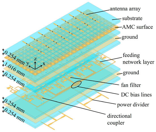 The proposed phased array shown in Figure 3 is constructed using the RPRDA elements. The phased array comprises 16 antenna elements arranged in a 2 × 8 configuration. The element spacing should be constrained to ≤0.5λ0 to control sidelobe degradation at large scan angles. Based on this consideration, the antenna array was configured with inter-column spacing of 3 AMC unit widths and inter-row spacing of 2 AMC unit widths. Since the width of an AMC unit is 3 mm, the row and column antenna spacing is 9 mm (0.51λ0) and 6 mm (0.34λ0), respectively. The multilayer structure integrates the antenna array, AMC surface, common ground layers, and feeding network, which includes both the RF fixed-phase feeding network and the DC bias lines. The layers are interconnected throughout the structure by metallic vias. The overall structure has a thickness of less than 2.5 mm.