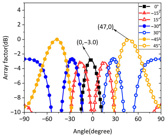 From numerous possible state combinations of the antenna array, 13 practical quantized beam directions were chosen. Among these, we further identified seven more widely distributed beam directions for comparative analysis, specifically 0°, 15°, −15°, 30°, −30°, 45°, and −45°. The normalized array factors for these directions were theoretically calculated and are shown in Figure 4. The array factor reaches its maximum at ±47°, showing a 3 dB enhancement compared to the 0° direction. This indicates that the array achieves a longer detection range at deflection angles of ±47°, which aligns with our intended application requirements.