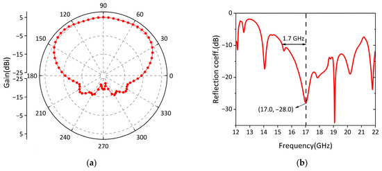 Simulation results of RPRDA: (a) H-plane radiation pattern; (b) reflection coefficient of RPRDA.